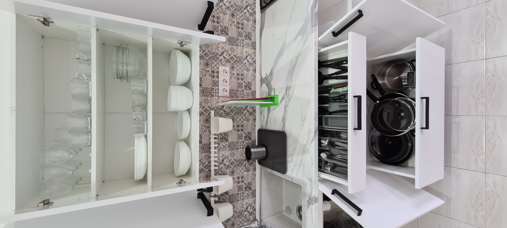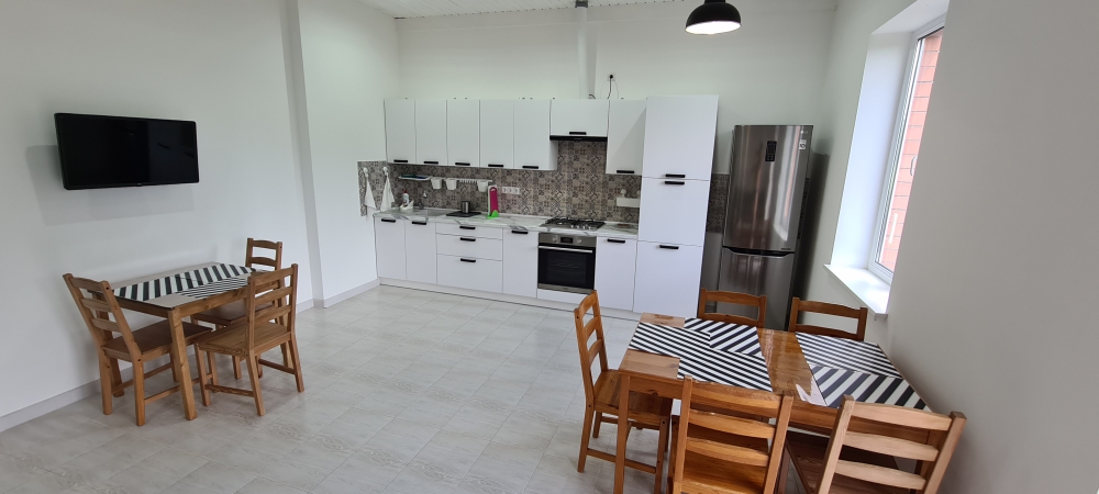Кухонная зона оборудована полностью для приготовления и приема пищи.
