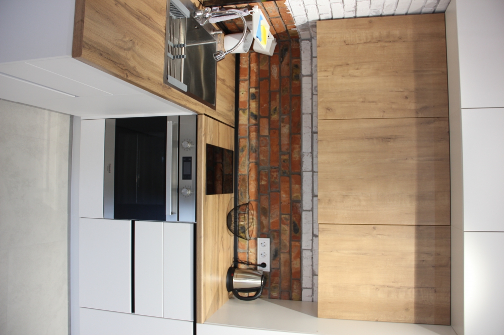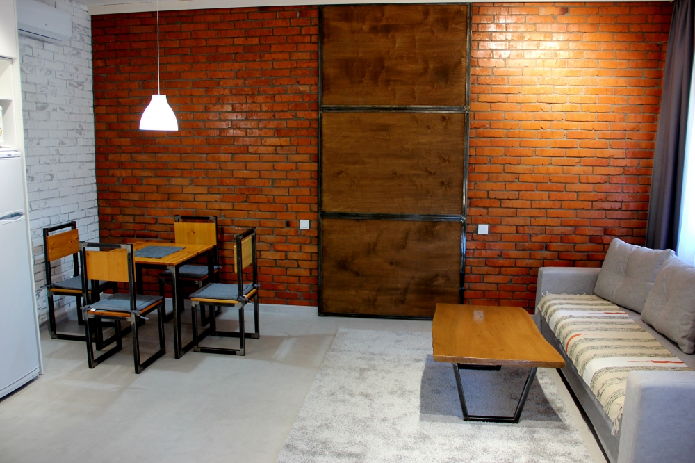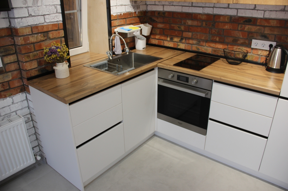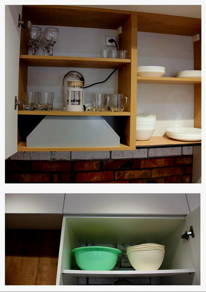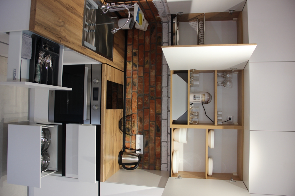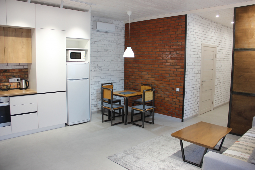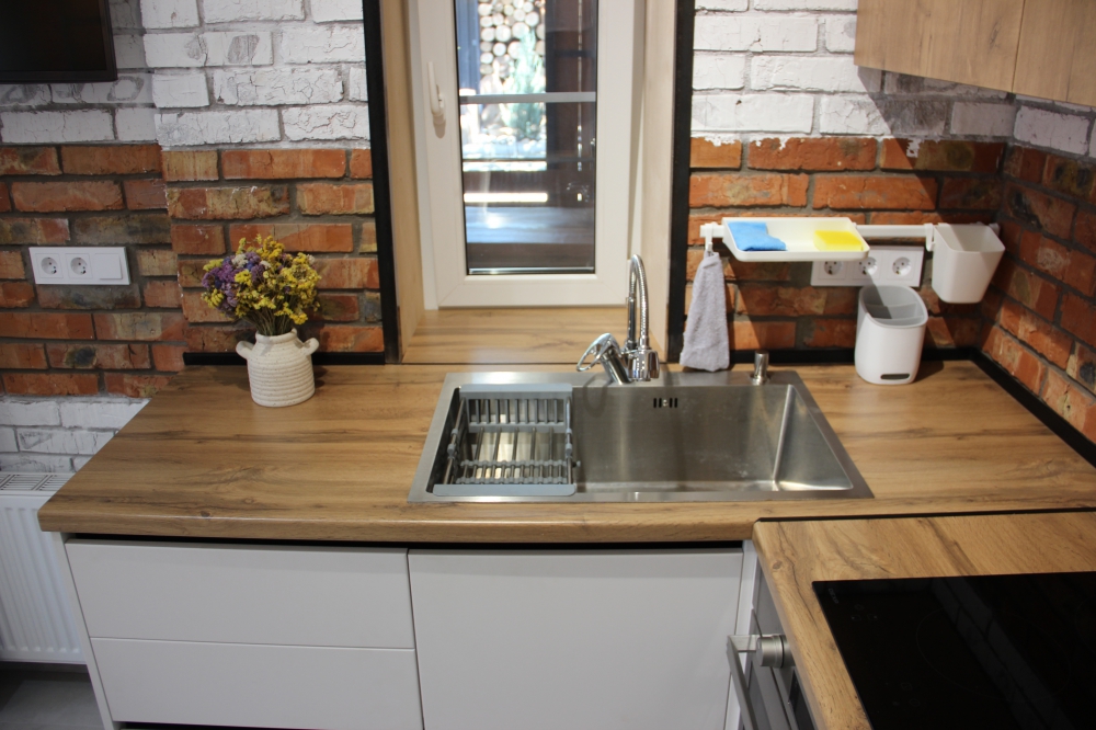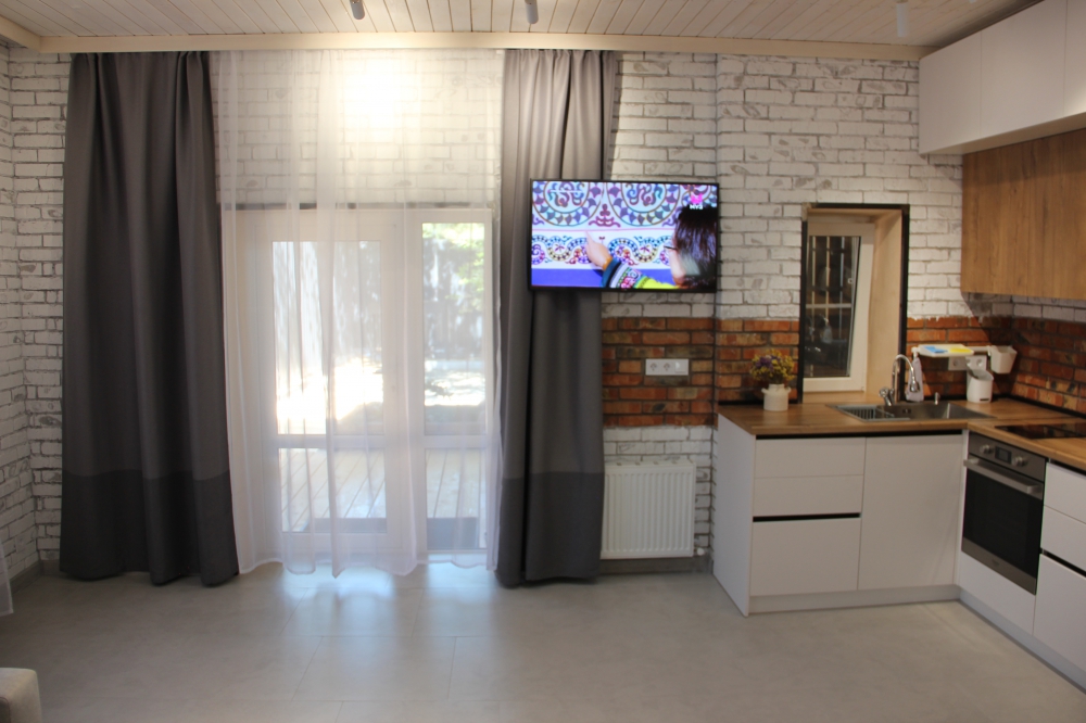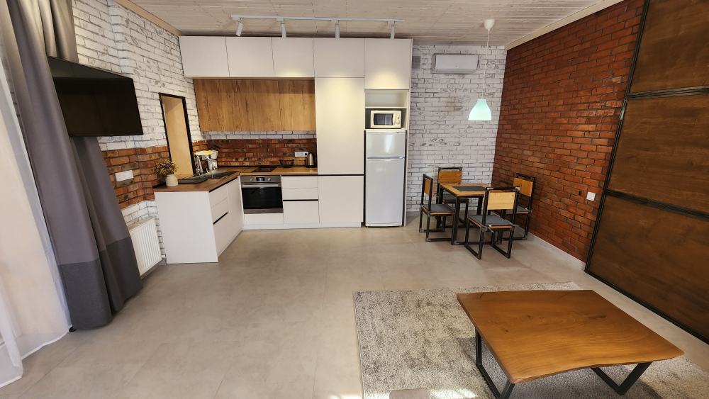 Кухонная зона оборудована полностью для приготовления и приема пищи.